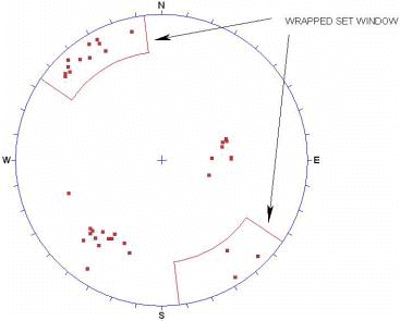 After you have selected the FIRST corner of a Set Window with the Add Set Window option, you will notice that if the cursor moves beyond the stereonet perimeter, it will "wrap around" and re-appear on the opposite side of the stereonet, with the window still attached.