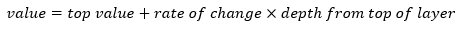 In this case, the rate of change is defined in the Value column. A positive or negative rate of change can be defined, and the value at a specific depth is calculated as: